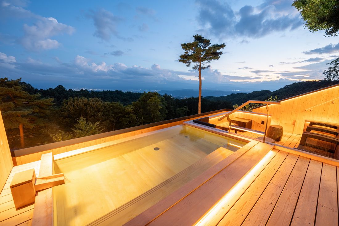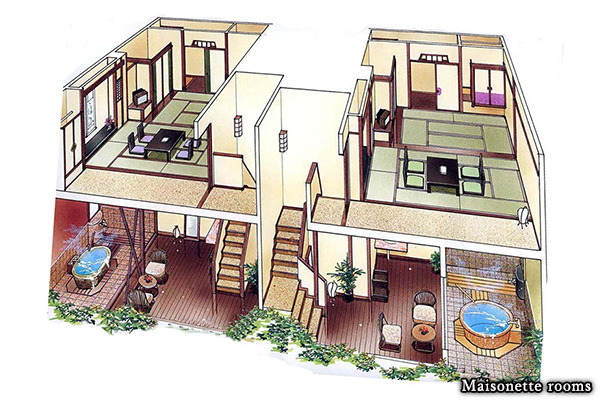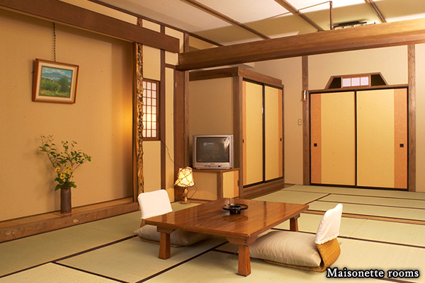Japanese-style en-suite rooms of 28.17m² with semi open-air baths. There is a large guest room on the 2nd floor, and a private semi open-air bath on the 1st floor.