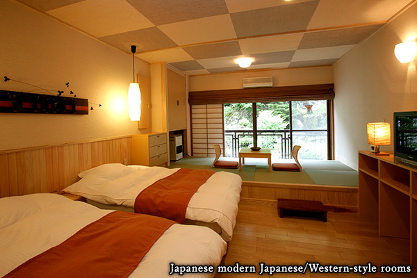 Japanese/Western-style rooms. Two semi-double beds and a tatami mat space of 4.96 m².