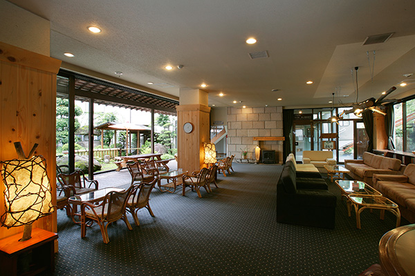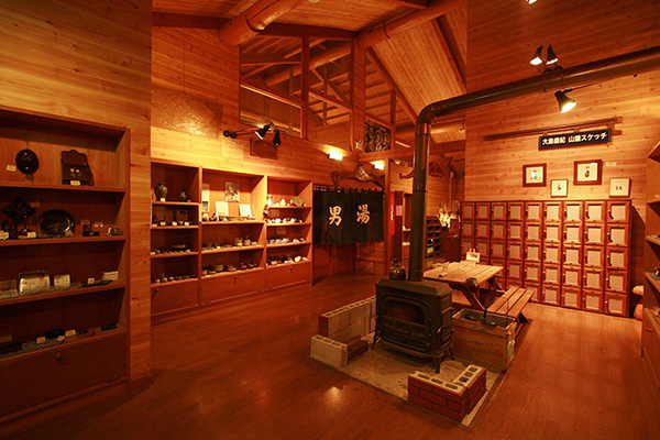 Spend a relaxing time in this warm space The warm ambience of the pellet stove gently soothes your heart. Enjoy a relaxing time with a cup of tea in the cafe corner beside the front desk. The boarding point for the cable car bound for the panoramic open-air bath, Kumonosuke, is at the end of the lobby. Various local products from Komoro, Shinshu are available in the shop.